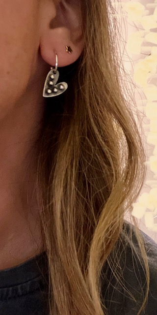 Aros de plata 950 colgantes de corazón envejecido y pelotitas. Las argollas miden 1 cm aproximado y los corazones 2 cm de largo.hecho a mano.